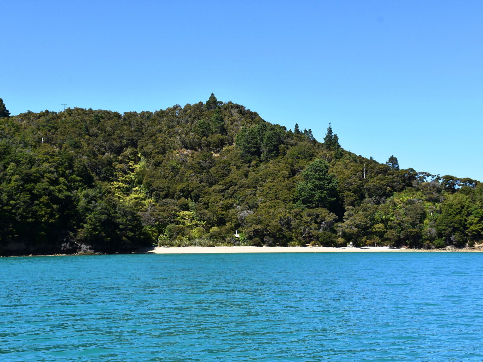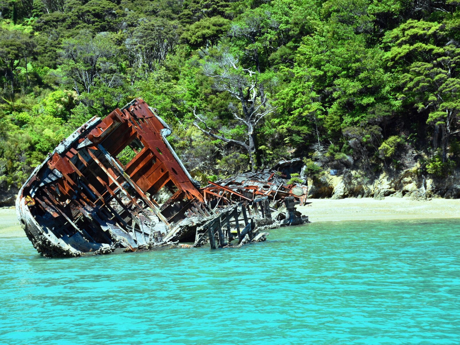 In the southern end of the bay there is the hulk of the sailing ship, Amokura, on the beach. This hulk is privately owned and has for many years been slowly dismantled for scrap.