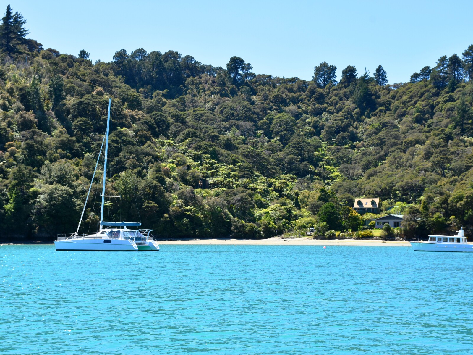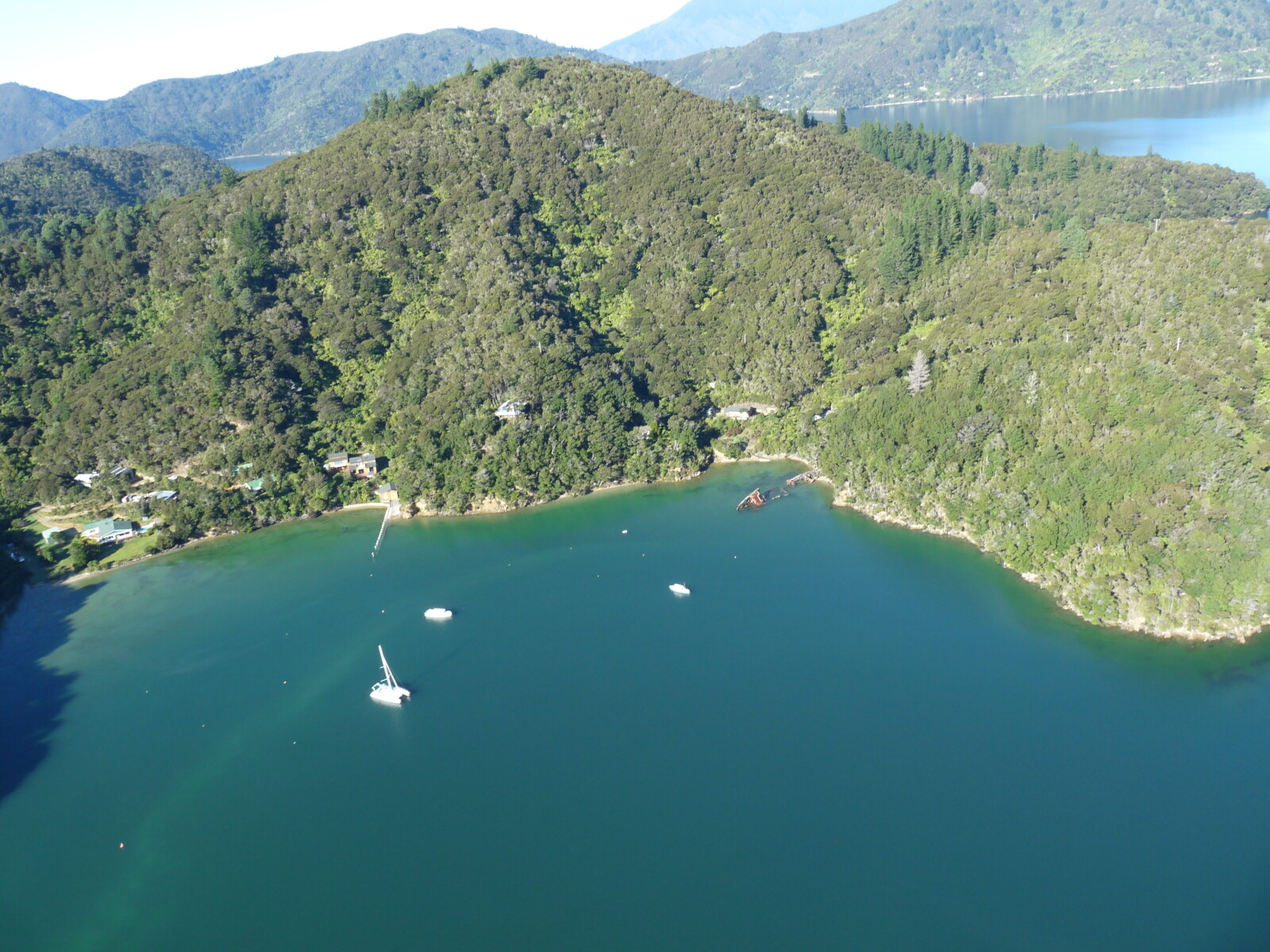 In S sector winds there is good shelter near the southern shore, between the hulk of the Amokura and the moored boats in this area.