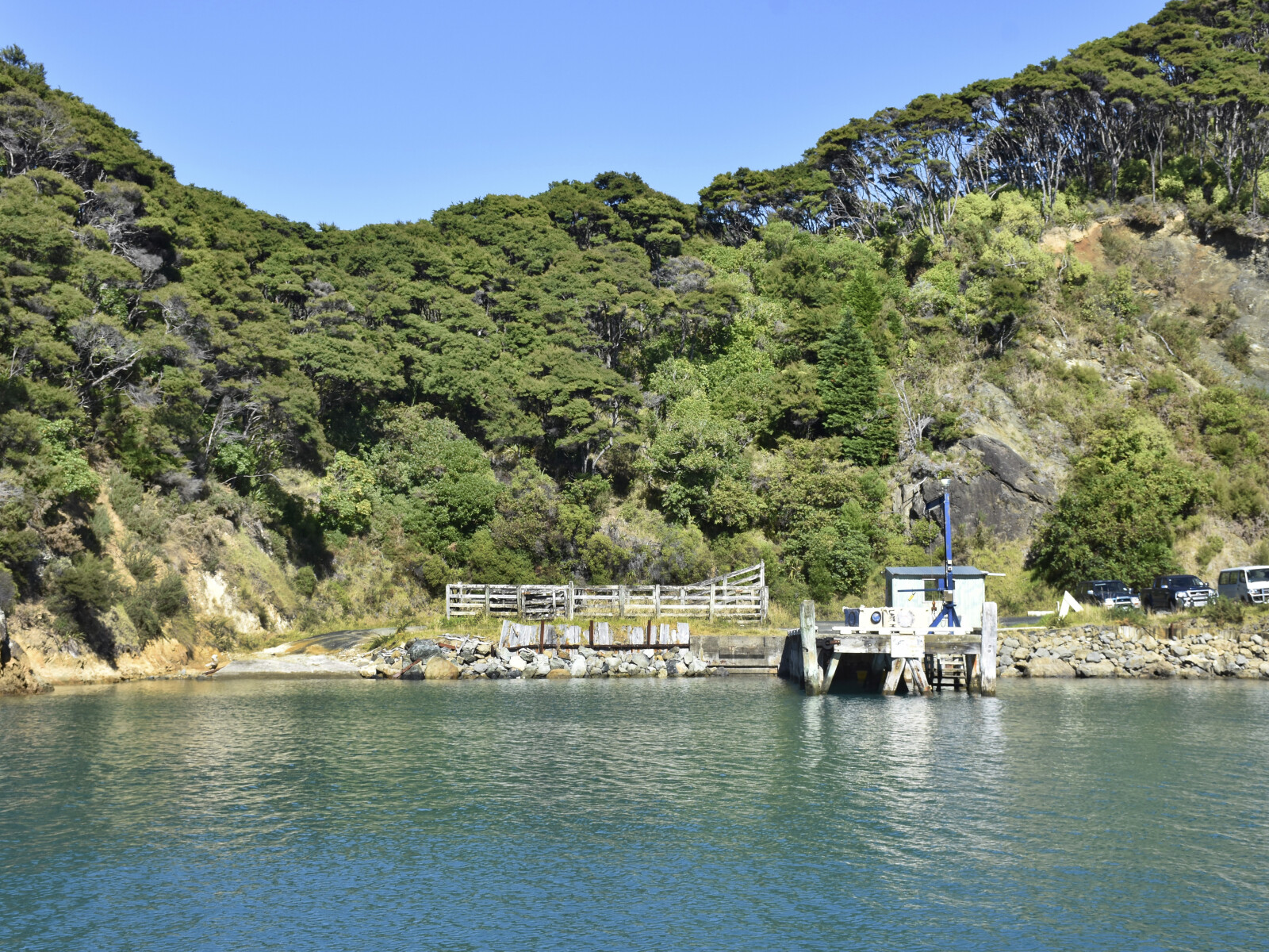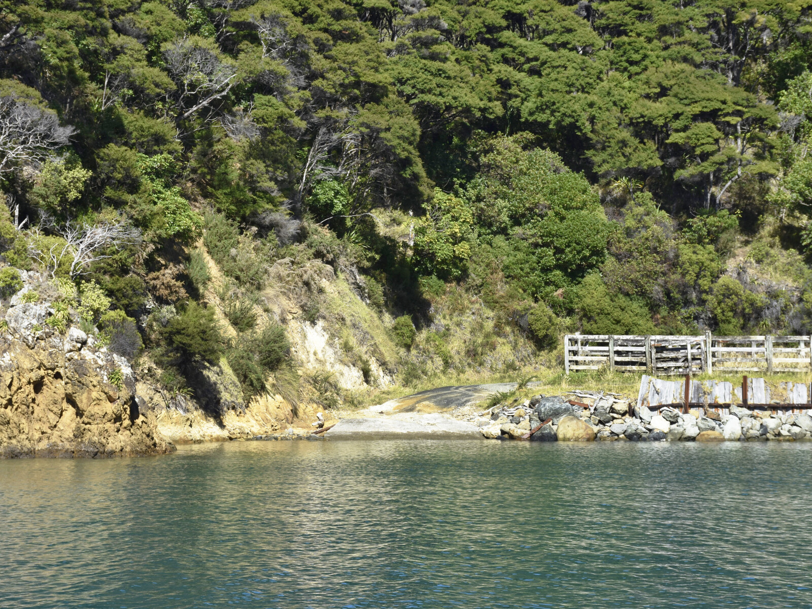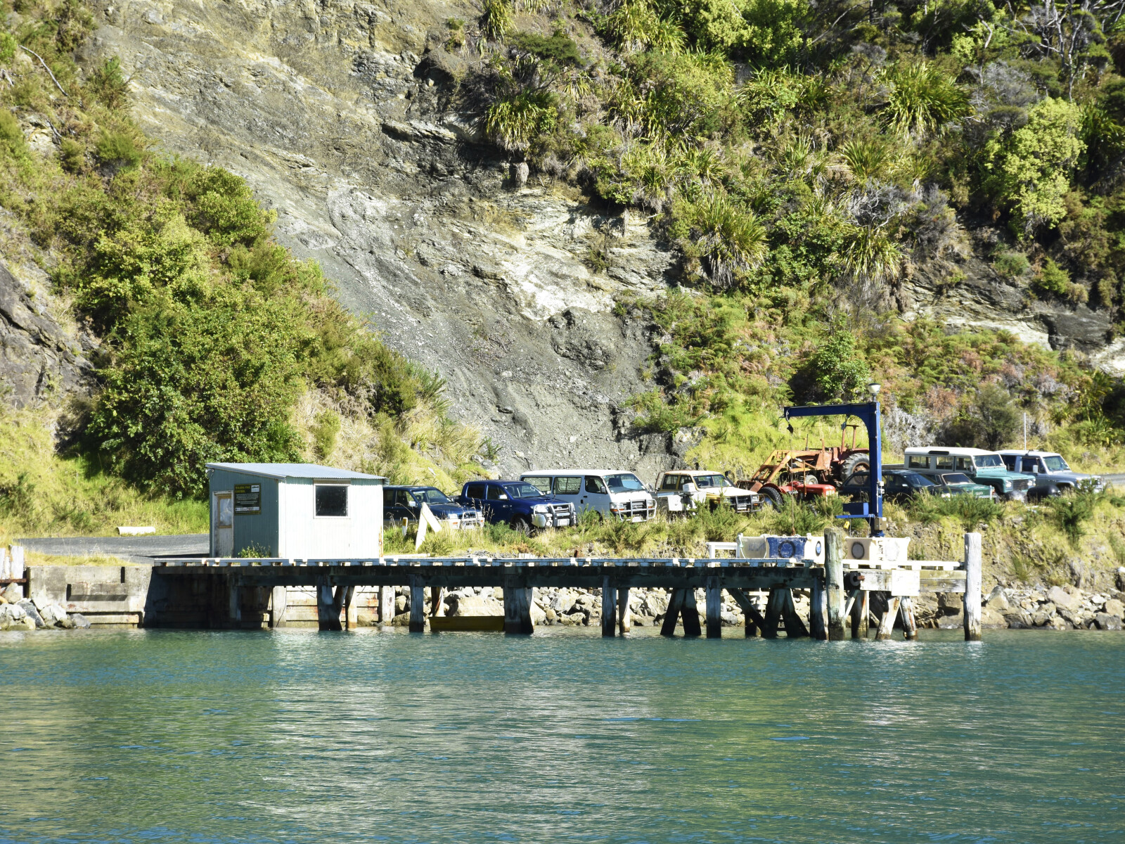The northern eastern entrance of the bay should be given a reasonable clearance to avoid rocks. There is a light on a white tower marking the western entrance to the bay. The bay is the terminus of the roads on D’Urville Island and has a wharf, launching ramp and fresh water hose.
