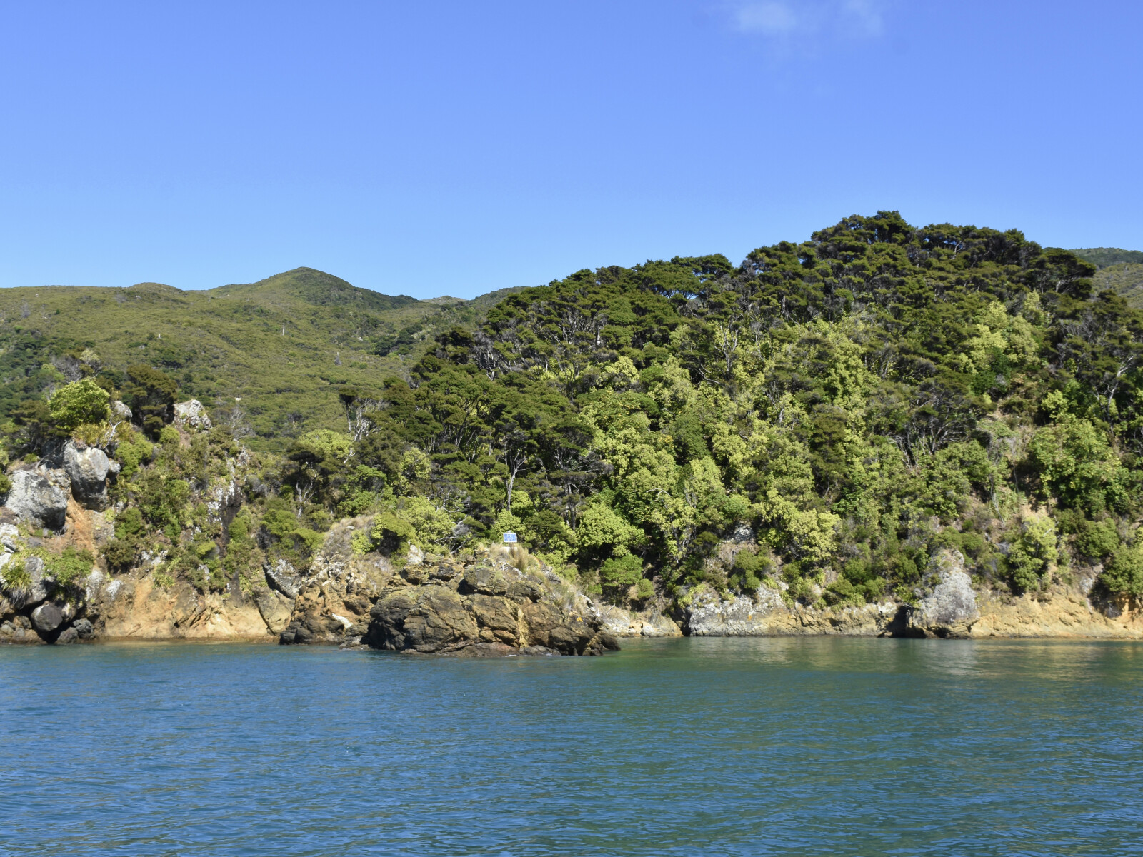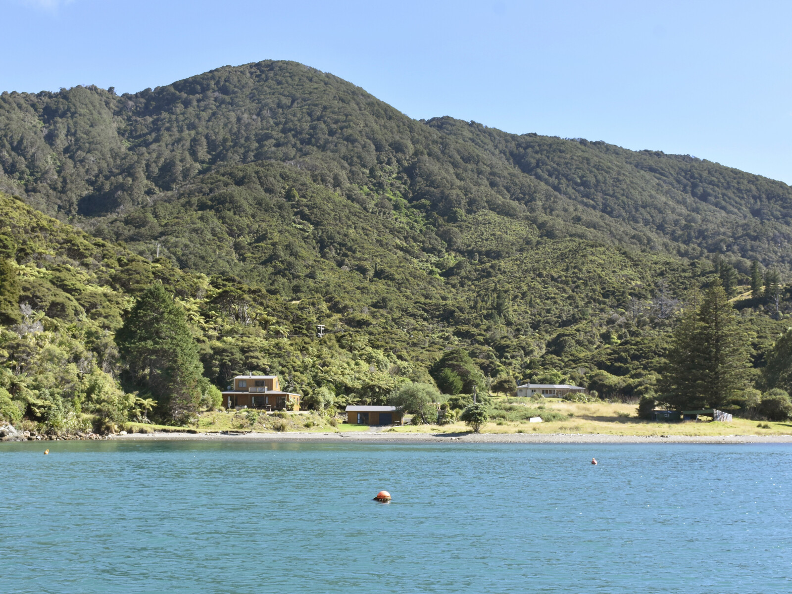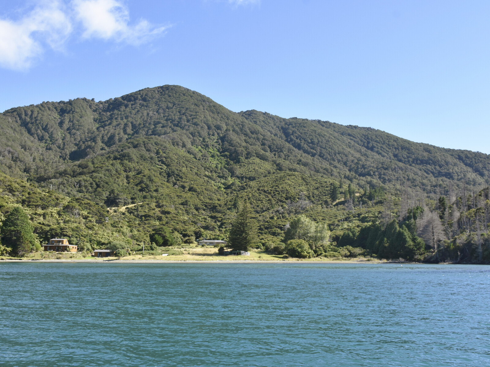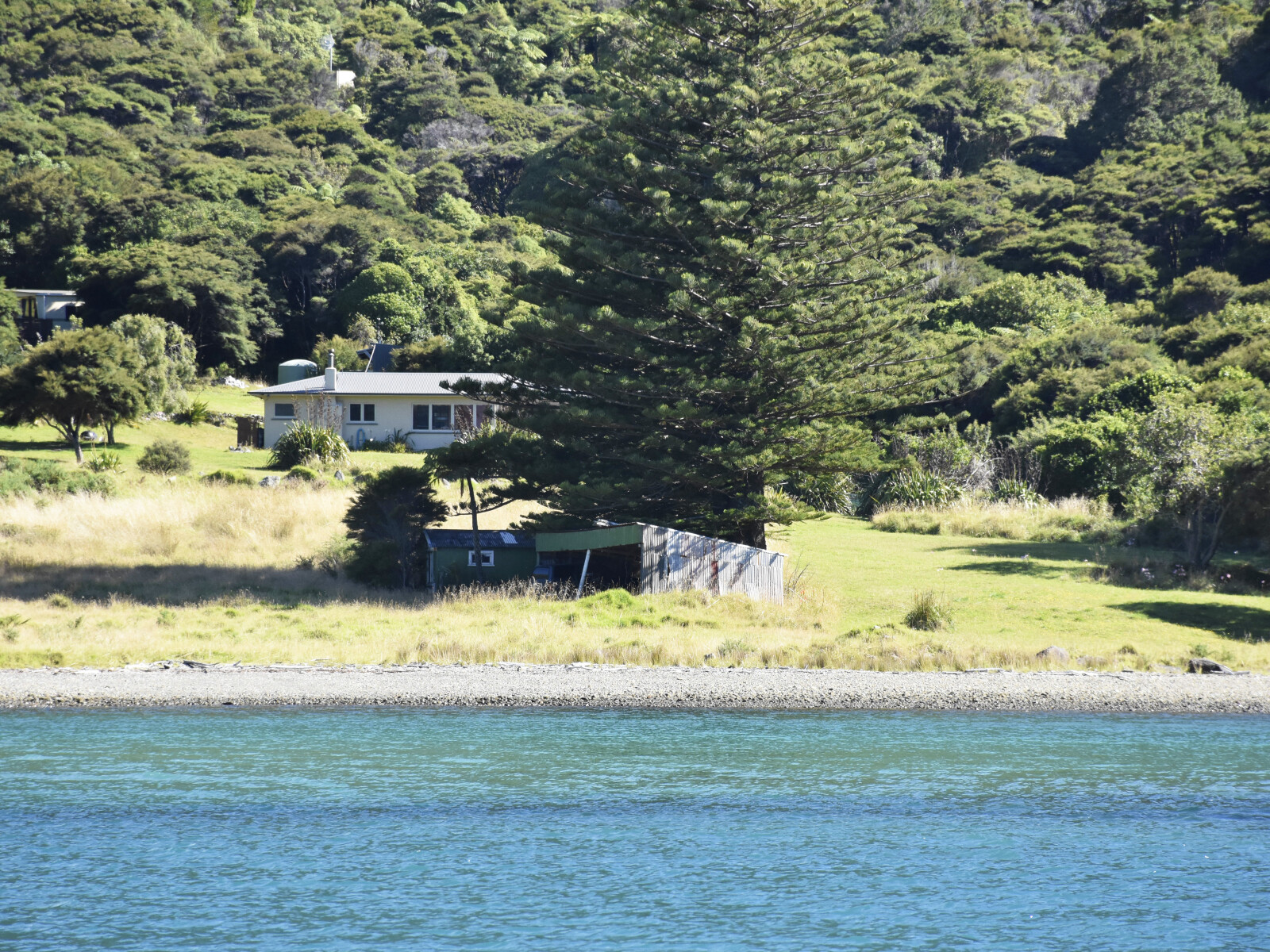 The northern eastern entrance of the bay should be given a reasonable clearance to avoid rocks. There is a light on a white tower marking the western entrance to the bay. The bay is the terminus of the roads on D’Urville Island and has a wharf, launching ramp and fresh water hose.
