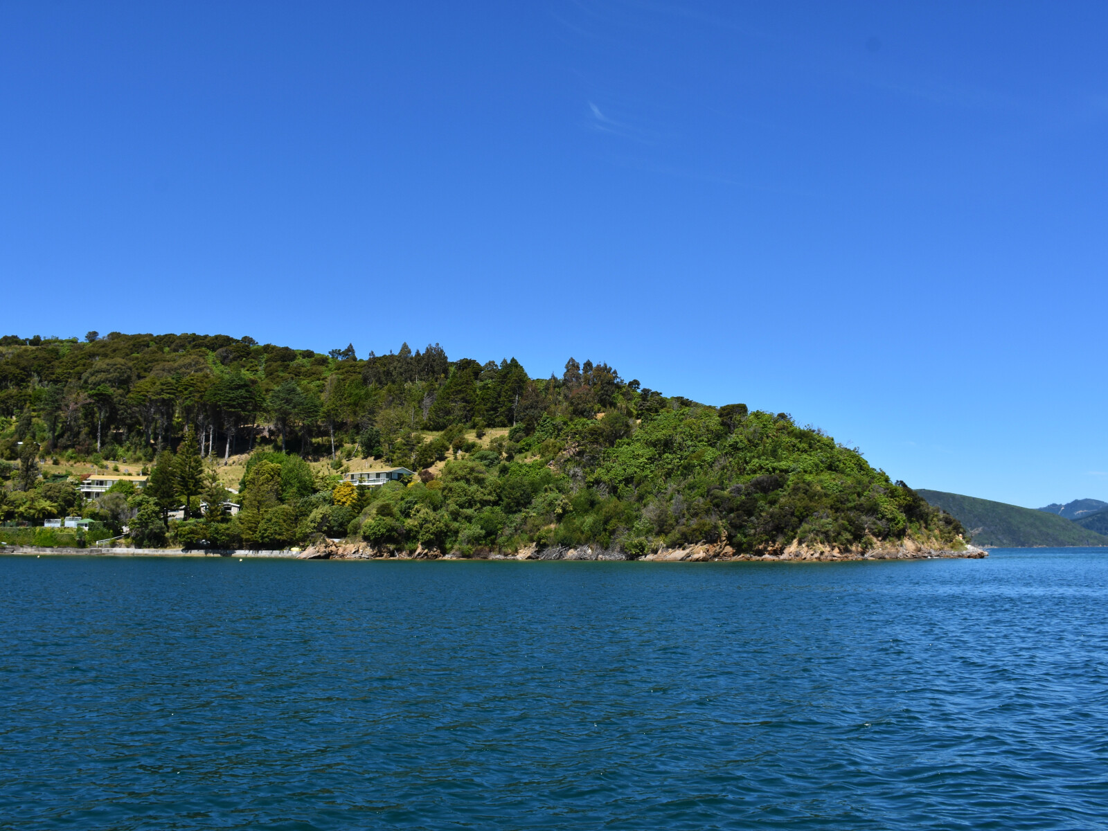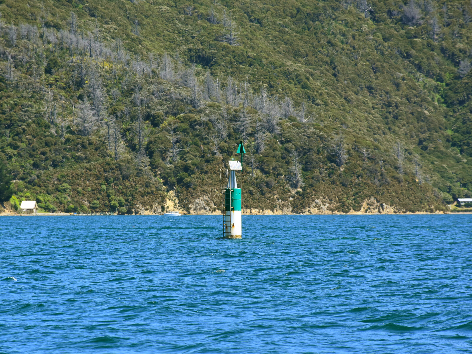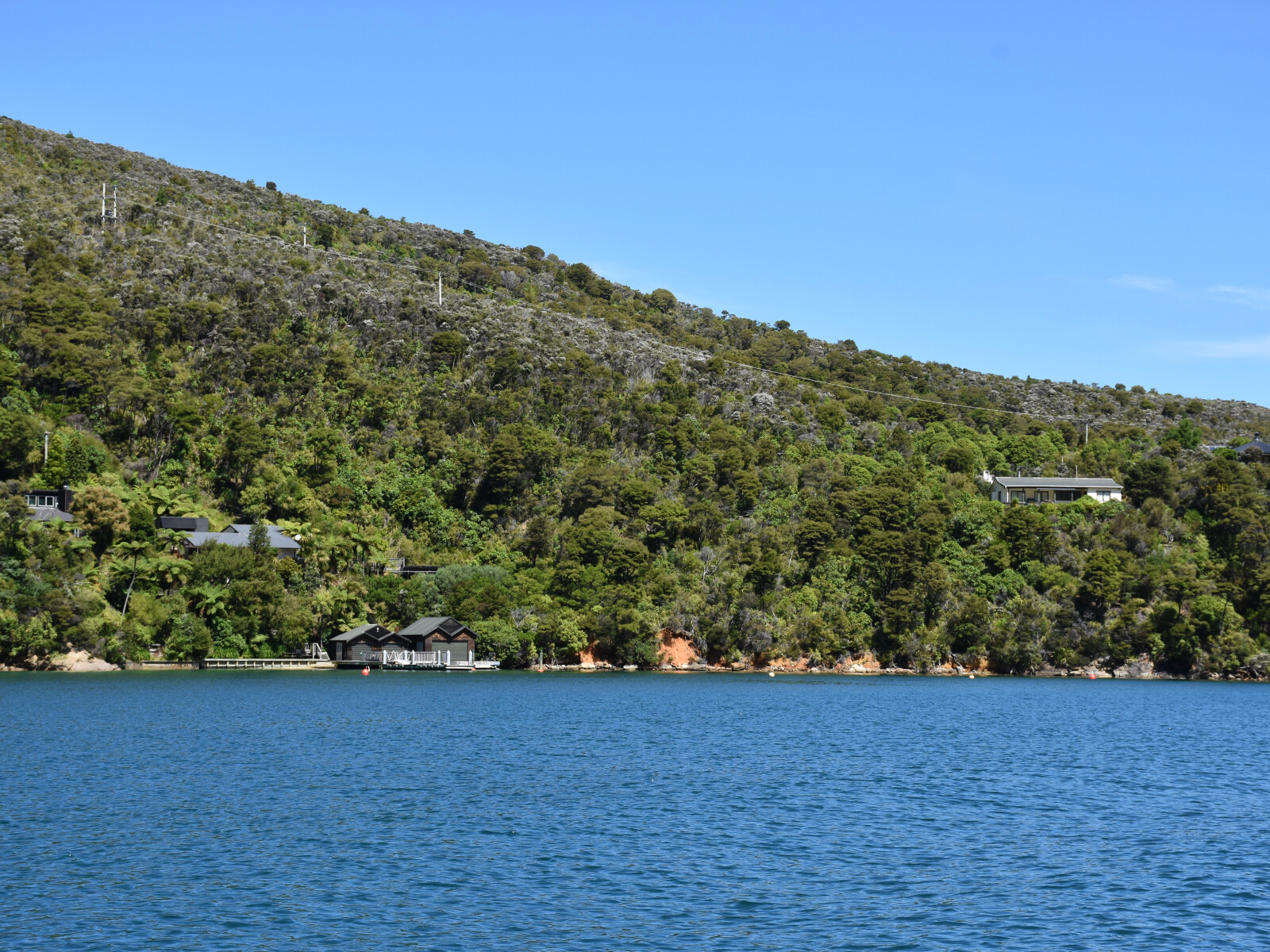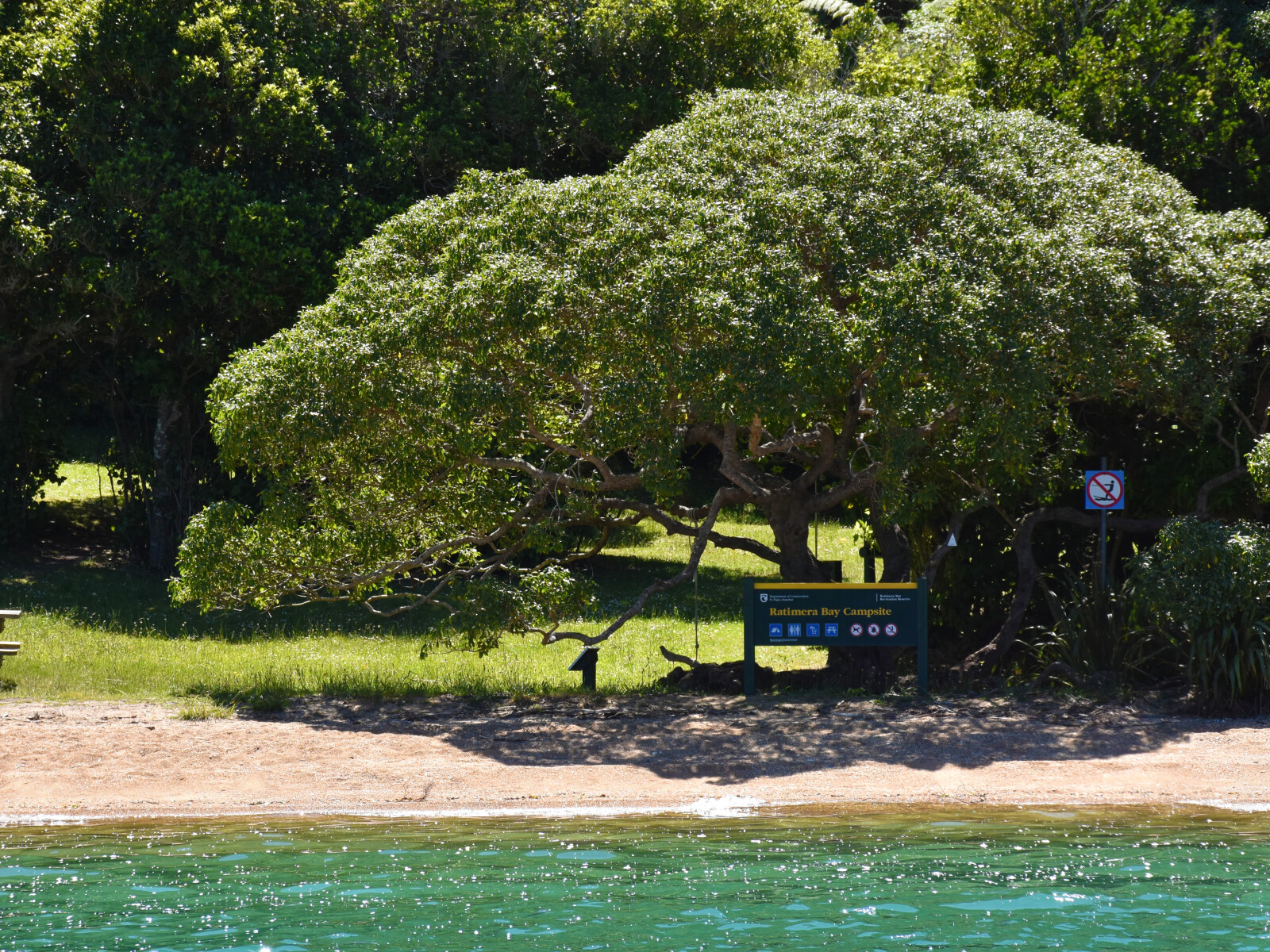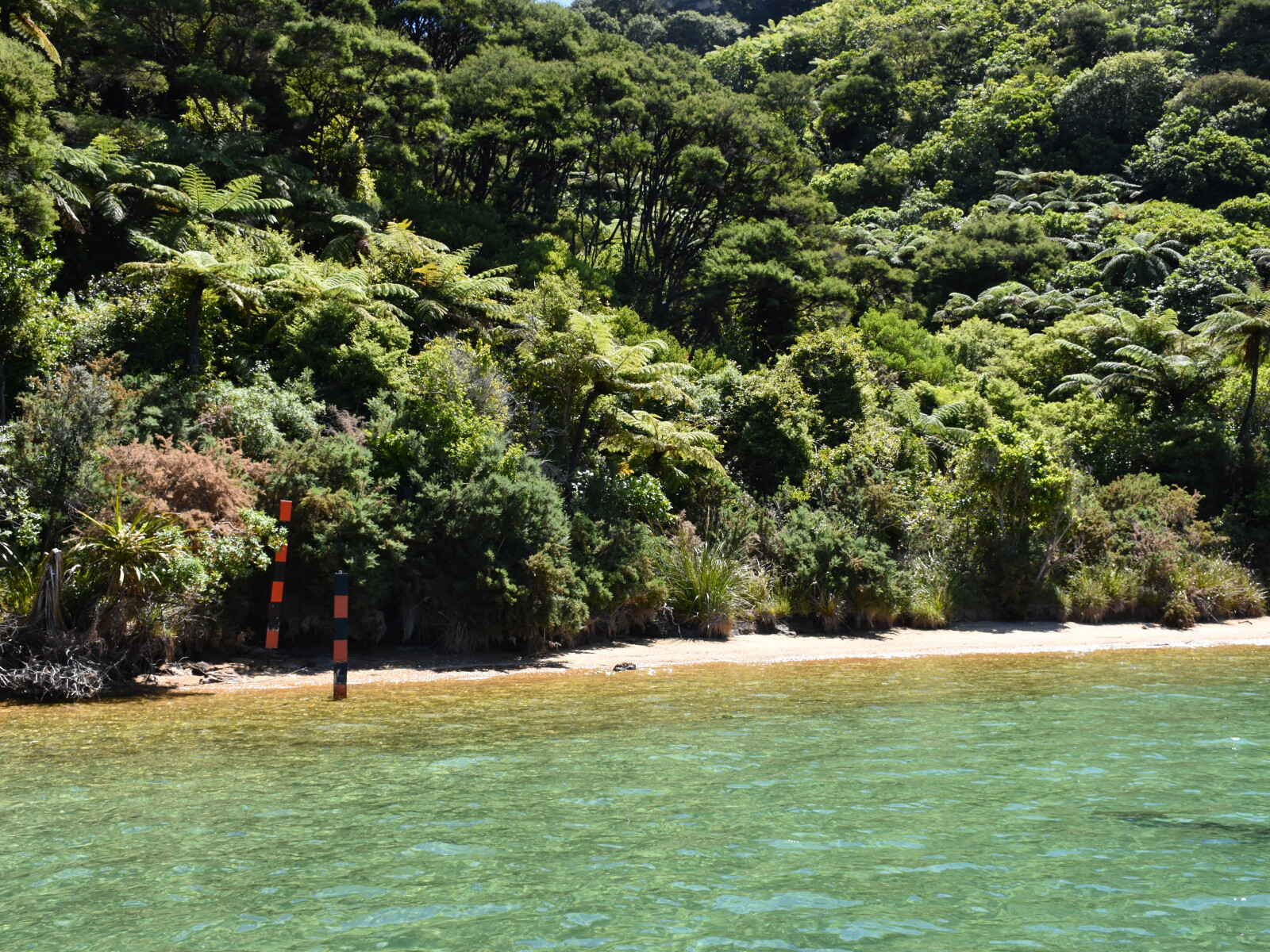 The western bay is a scenic reserve. It is a little open to wind, has a beach and a ski lane called Cherry Bay. The eastern bay has little beach, except at LW, and no foreshore. It is possible to put a stern line ashore here, if required.