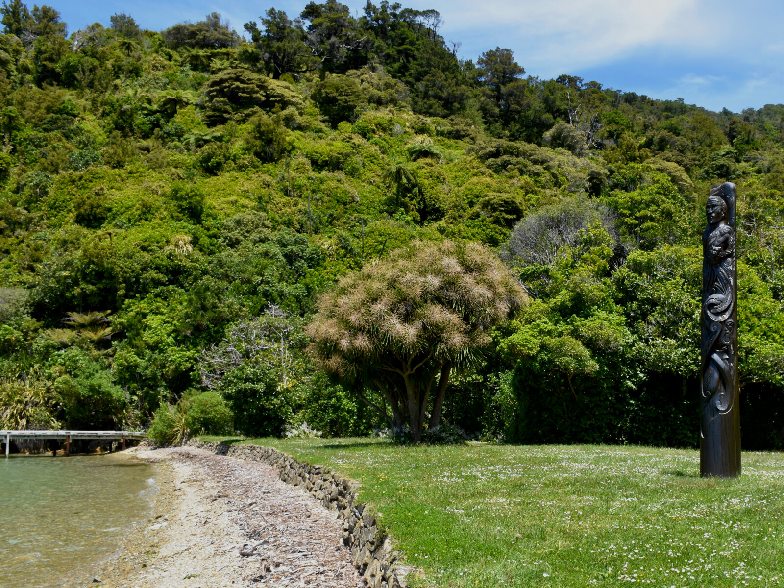 In 2006 the Department of Conversation and iwi worked together to redevelop an area of the bay in order to provide a bicultural interpretation of the site. Three pouwhenua (carved wooden posts) were installed on the site, one depicting the Polynesian explorer Kupe and his arrival in the area, and two depicting the iwi with associations to the bay.7
